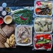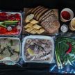 Свинной шашлык; куриные бедра в домашнем соусе с карри; свежие нарезанные овощи (перец болгарский, помидор,огурец свежий, редиска); зелень (лук, петрушка , укроп, перчик острый); крафтовый хлеб(ржаной и пшеничный); соус барбекю, смесь соли с перцем
